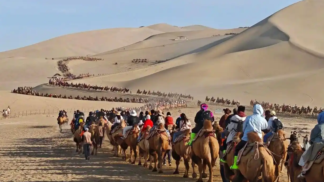 新闻头条今日要闻:这个国庆中秋假期,各大景区人头攒动。甘肃省敦煌市的鸣沙山月牙泉景区迎来大批游客,再次出现“堵骆驼”的情况。有网友打趣道:“告诉王维,西出阳关全是人。”